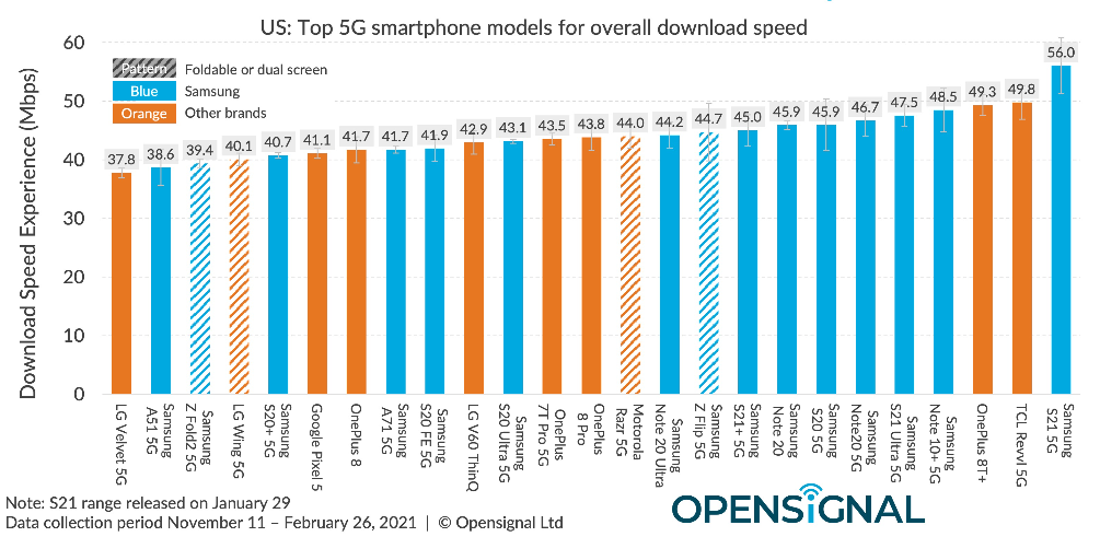 미국에서 다운로드 속도가 가장 빠른 25대의 스마트폰 모델 중 60%가 삼성 스마트폰 모델이 차지하고 있습니다. 그만큼 속도 경쟁에서 매우 높은 점유율을 가지고 있습니다. 밑에 그래프를 보시다시피 삼성 갤럭시 S21 5G가 56.0Mbps로 평균 다운로드 속도가 가장 높았으면 S21 시리즈의 나머지 두 모델도 상위 10위에 포함된 것으로 확인됩니다.