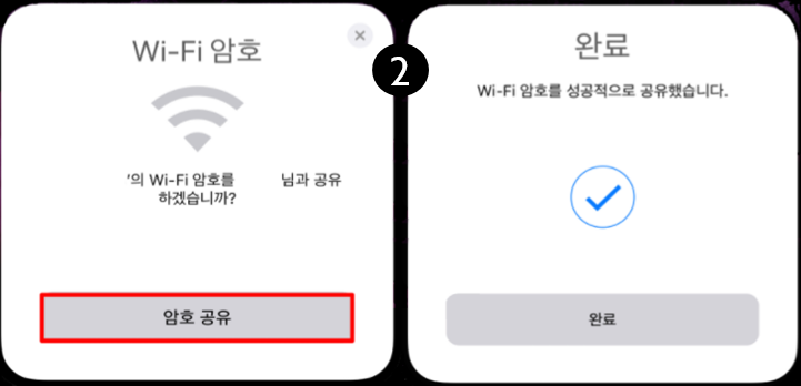 ③ 공유하려는 아이폰에서 Wi-Fi 암호 메시지가 뜨면 공유 버튼을 눌러주시고 상대 아이폰이 성공적으로 공유가 됐는지 확인하시면 완료됩니다.