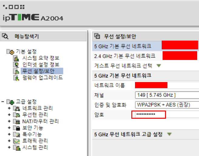 ② 좌측 메뉴탐색기 기본설정에 무선 설정/보안을 클릭해 주십시오.