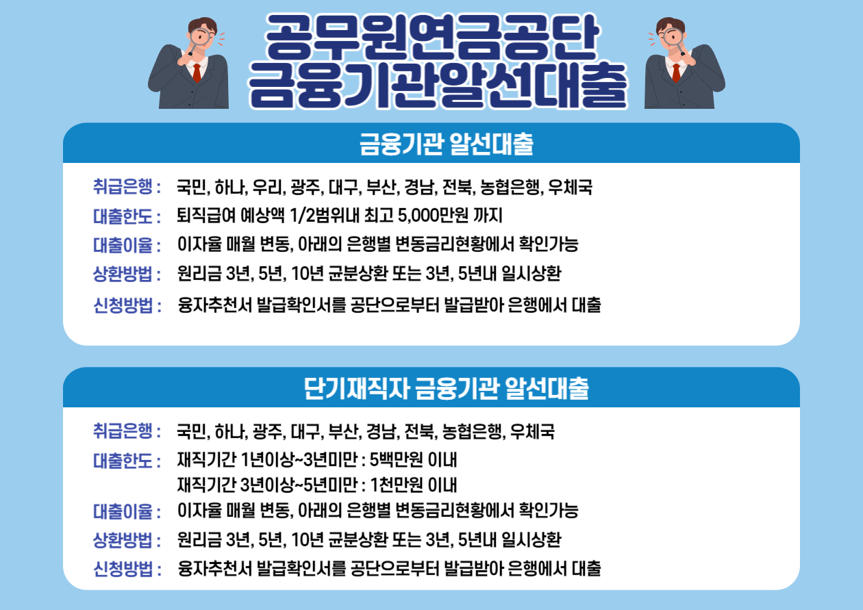 지금까지 공무원연금공단을 통해 직접 지원받을 수 있는 공무원 연금 대출 종류 3가지와 협약된 은행을 통해 진행할 수 있는 금융기관 알선대출에 대해 알아보았습니다.