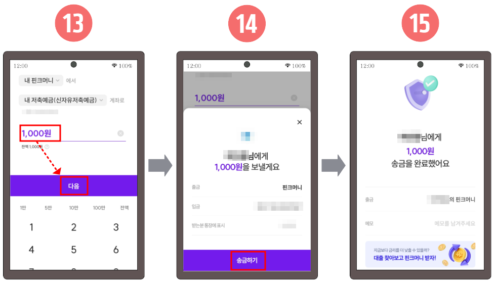 13~15. 내 핀크머니에서 내 계좌로 송금받을 금액을 입력한 다음 이름과 입금계좌가 맞는지 확인하신 후 "송금하기" 버튼을 클릭하면 최종적으로 현금화가 완료됩니다.