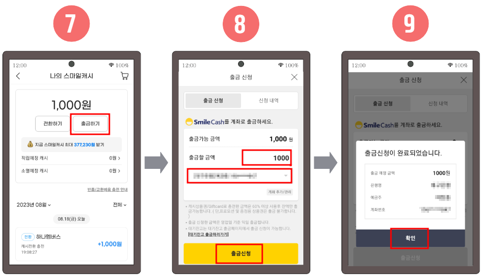 7. 포인트 전환이 완료되면 나의 스마일캐시 잔액에서 전환된 금액이 표시되므로 계좌 송금을 원하시면 "출금하기"버튼을 클릭합니다.