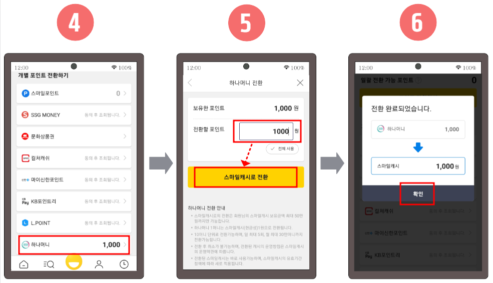 4~6. 아래의 개별 포인트 전환 메뉴에서 하나머니를 찾아 클릭한 다음 개인정보 제3자 제공 동의가 완료되면 보유한 포인트를 확인하실 수 있고 전환할 포인트를 입력 후 하단의 "스마일캐시로 전환"버튼을 클릭하면 하나머니에서 스마일캐시로 전환이 완료됩니다.