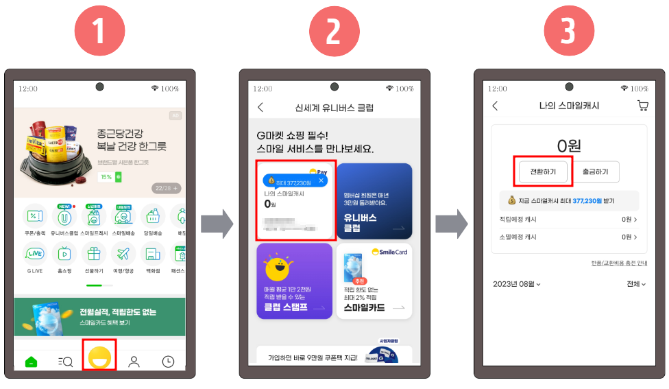 1~2. 먼저 지마켓 앱을 실행한 다음 로그인 후 하단의 스마일 모양의 아이콘을 눌러 "나의 스마일캐시"를 클릭합니다.