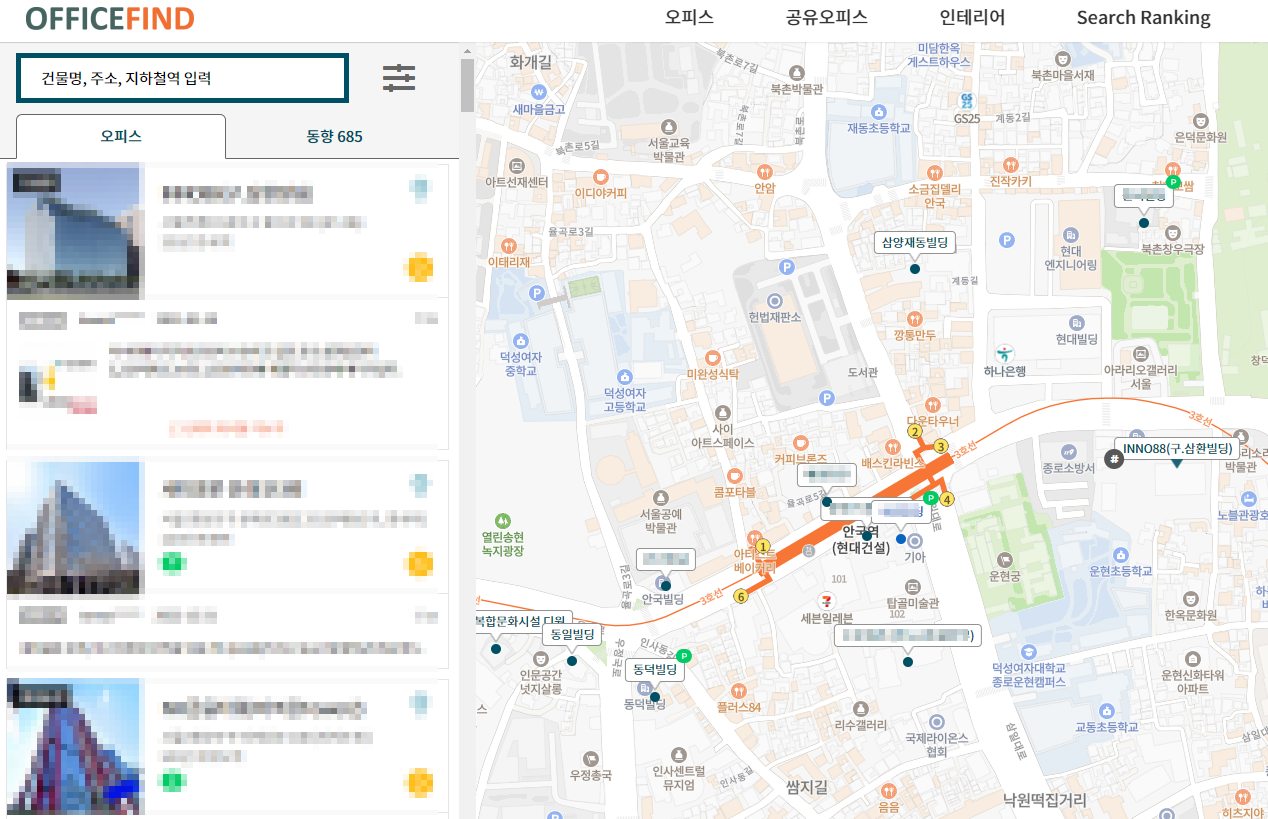 사무실 임대 사이트 "오피스파인드"는 건물명, 주소, 지하철역 입력을 통해 근처 사무실 및 공유오피스를 쉽게 찾으실 실 수 있습니다.