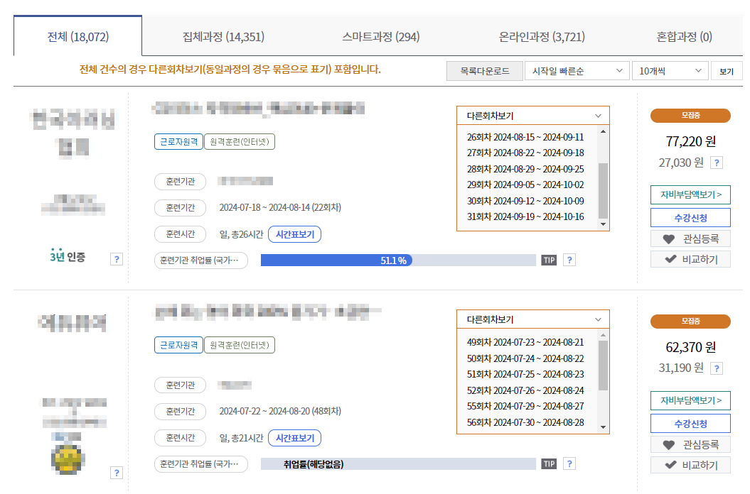 그다음 검색키워드, 지역, NCS 직종, 훈련유형, 개강일자 등 검색조건을 활용하여 원하는 훈련과목을 찾아 수강신청하시면 모든 절차가 완료됩니다.