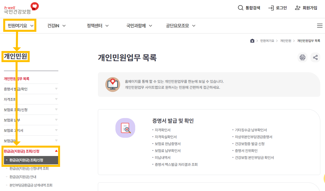 2. 홈페이지 상단 민원여기요 > 개인민원 > 환급금(지원금) 조회/신청 순으로 클릭
